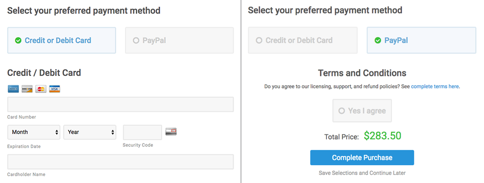Separated into logical sections that include extension selections, all that a customer needs to do is select the extensions that fit his or her business needs, enter personal and payment information, agree to the terms, and complete the purchase.