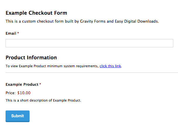 Lastly, custom checkout forms created through Gravity Forms require that you use Gravity Forms add-ons to add additional functionality to the forms themselves. That means Easy Digital Downloads payment gateways will not work with Gravity Forms Checkout.