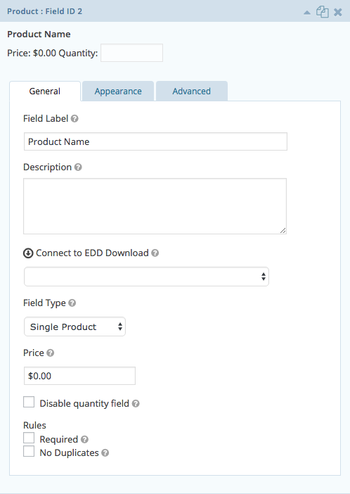 2. Add a new Product field to your form. Configure the Product field to connect to one of the Easy Digital Downloads products that you referenced from your checkbox choices. On the General tab settings for the Product, set its Field Type to “Single Product” (it cannot be hidden) and give it a price. On the Advanced tab, check the Enable Conditional Logic setting and set the field to only show if the correct “Choice” from your checkbox field in step 1 is selected.