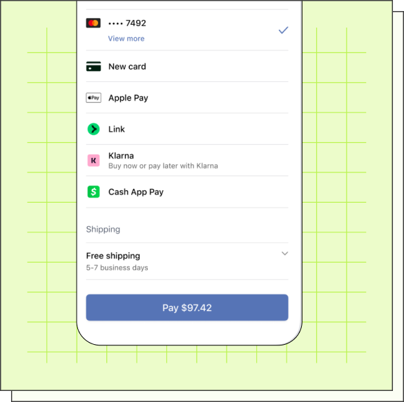 Boost conversions by eliminating manual form filling. Customers can buy in seconds using Apple Pay, Google Pay, or saved cards.