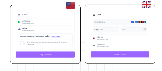 Automatically display relevant payment methods based on location and purchase to reduce friction and boost sales.