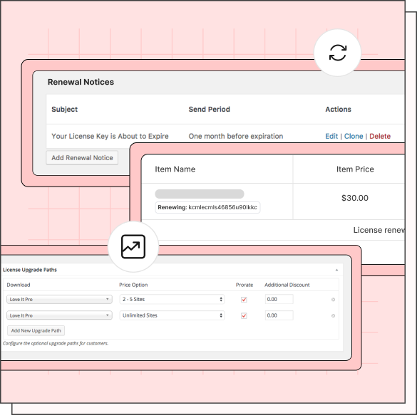 How does the license renewal system work?EDD automatically sends customizable renewal reminder emails, applies targeted renewal discounts, and provides customers with one-click checkout links. When combined with EDD’s Recurring Payments feature, you can even enable fully automatic subscription renewals.